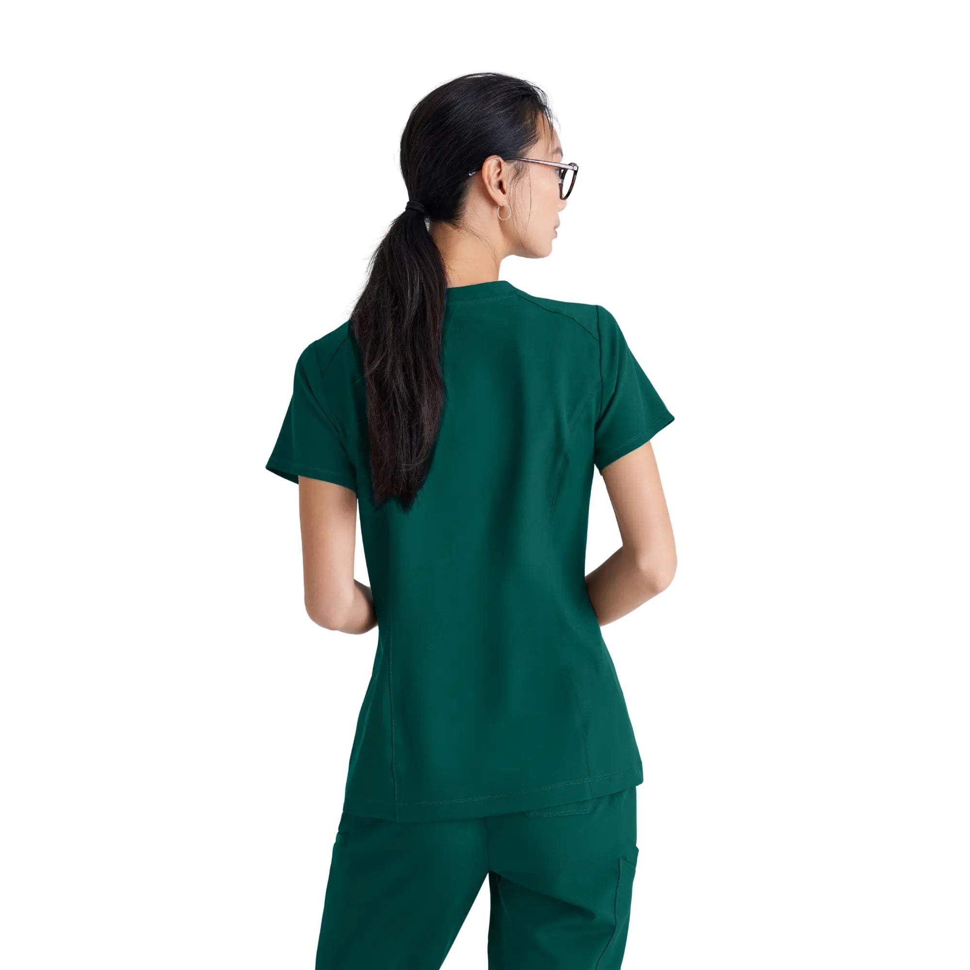 The Grey's Anatomy by Barco Sway Tuck-In Top (Evolve Collection) combines sleek design with all-day comfort . Its classic fit is enhanced by a banded modified V-neck and a high-low asymmetric hem , while princess seams ensure a flattering silhouette. The green Evolve logo loop provides a convenient location for your badge. Made with recycled polyester and CiCLO® technology , the fabric is soft, stretchy, and breathable .
